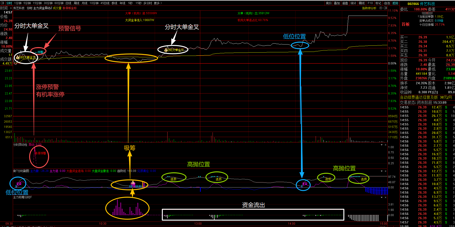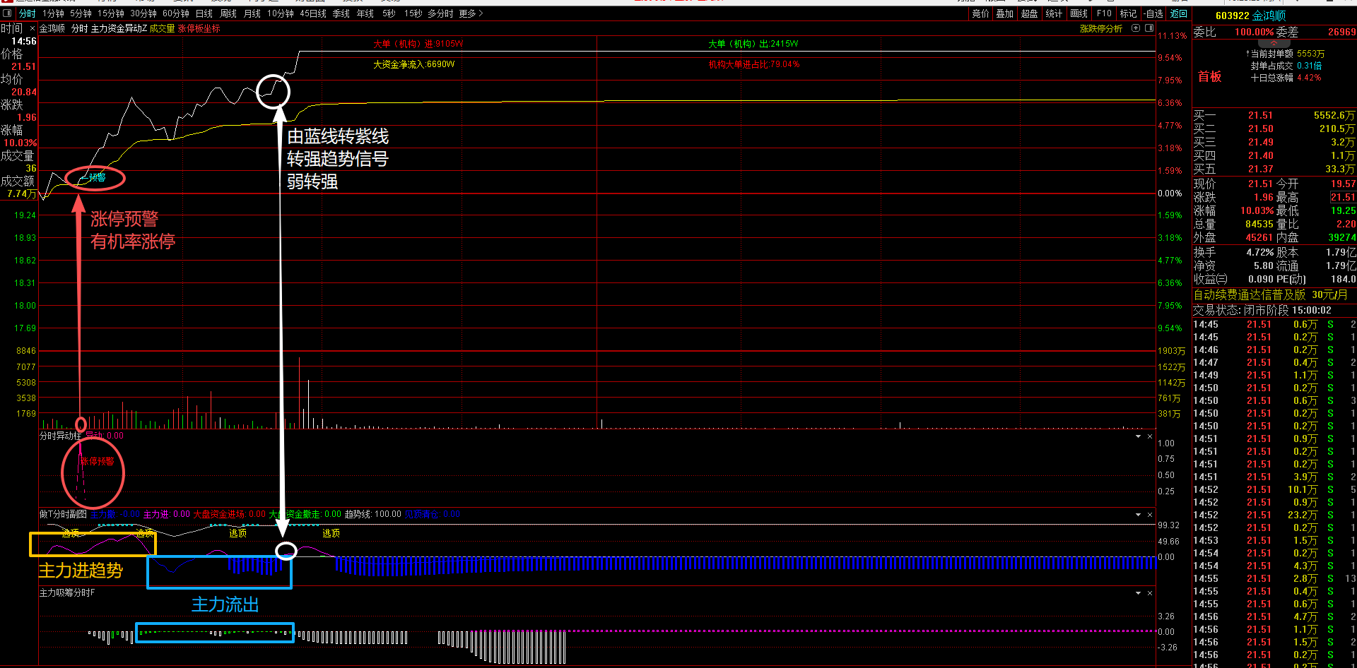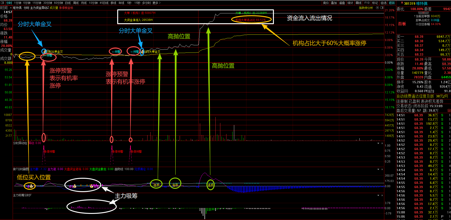 分时主图中显示大单资金进出情况数据,方便使用者辅助判断,当图中出现 钱袋子+单比分时大单金叉,机构大单进占比大于50%,当日涨停概率较大;