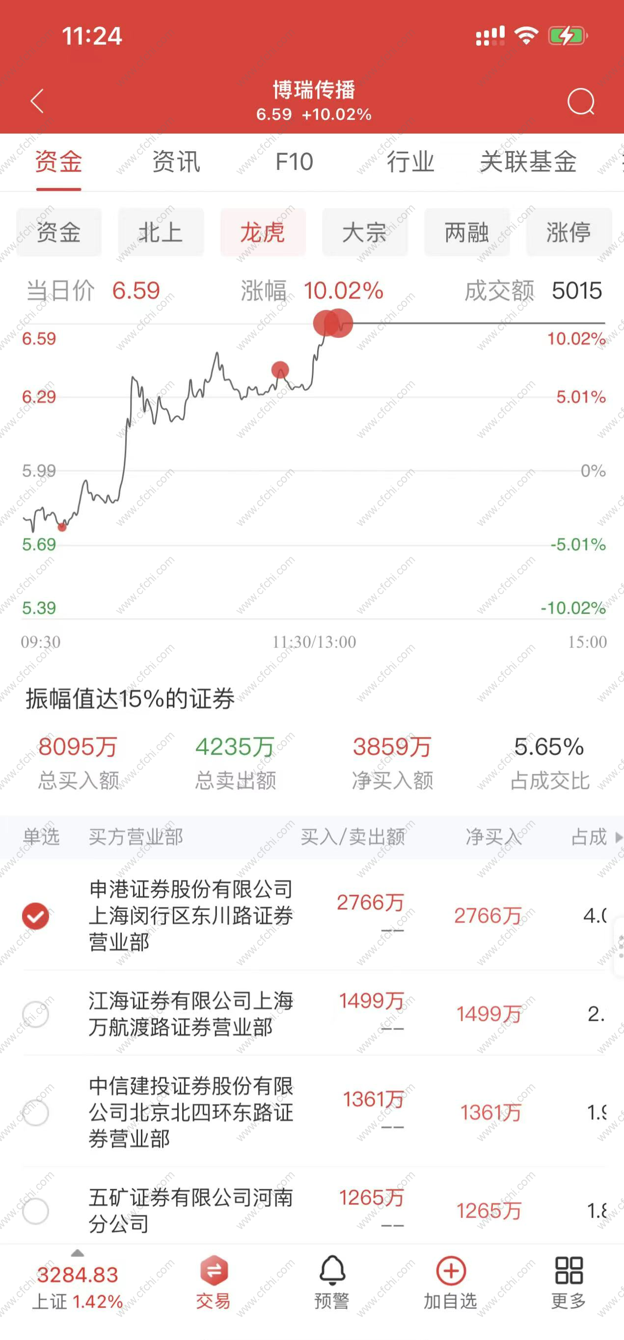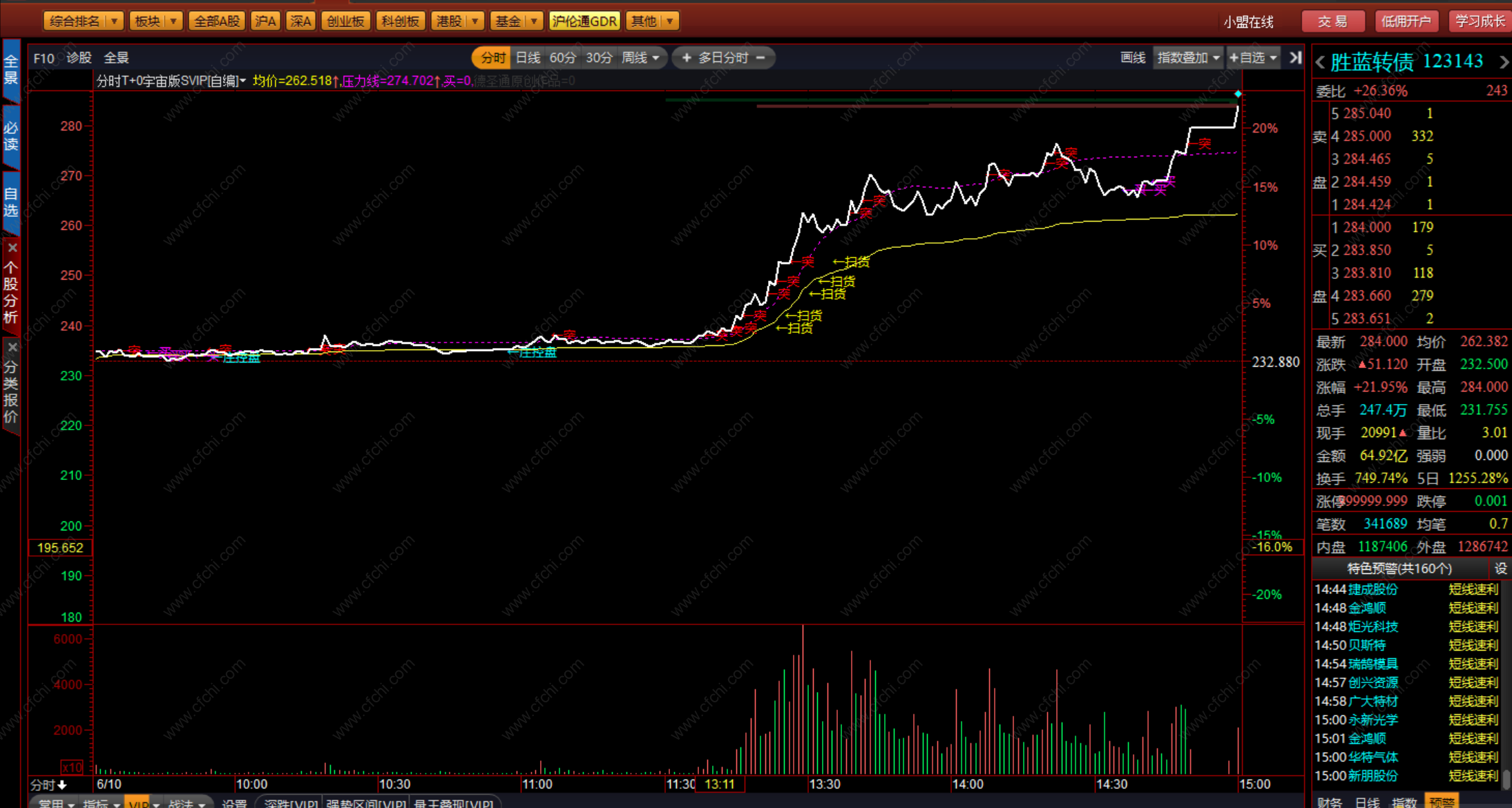 分时T+0神器,比任何人的神器都牛逼,特别是神创的压力线,一旦突破它就是封板,突破不了就无法封板,另外神创了买的信号,一旦出现买的信号,毫不犹豫买入即可。另外这个指标更加牛逼的地方是实时反映游资和机构扫货和买入的位置,比如600880博瑞传播,你们就能看到华泰证券封板的位置。比如你能看到申港证券在最低位置买入,也即神创的买信号,即买=1这个位置就直接反馈了游资买入了,我们看会龙虎榜就看到是申港证券在这个位置买入,所以老夫这个指标是不是神器,你们任何人的指标有这样的功能不?而且这个指标任何益盟版本都可以使用,即使你没BS,没付费益盟,和谐版,正版,有账号,无账号等统统都可以使用这个分时指标,完全给你们打通了,不会有任何限制,全功能开放给到你们,就是这么牛逼。反正你们有了这个指标,其它任何人的益盟分时指标都可以不用去考虑了,重点是做到了精准,其它那些指标都是事后诸葛亮的,而且还拿各种益盟的东西去套指标,套涨幅,所以凡是在使用益盟,都好好看看,认真看看这个贴,宇宙版的分时T+0,你们一定会喜欢上的,重点是你们那些喜欢做短线打板的,这个指标就是你们复利的神器,看穿主力庄家。