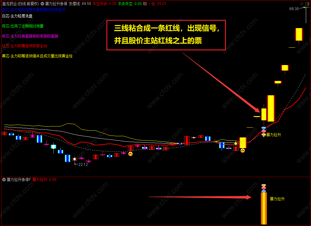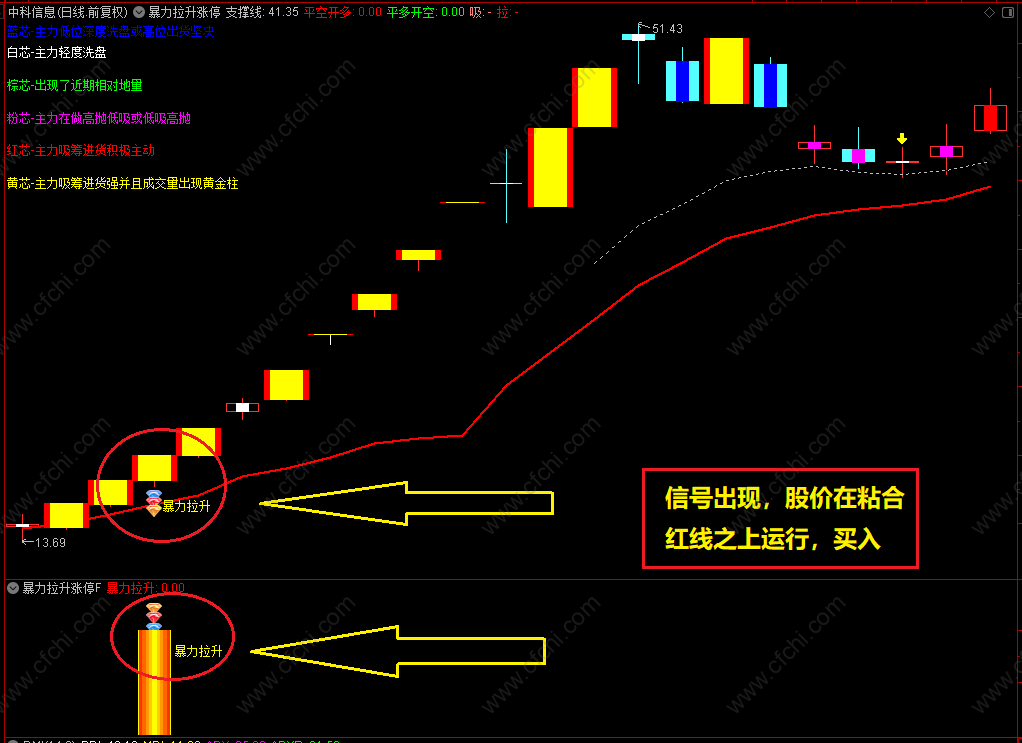 信号出现,股价在粘合成一条红线之上运行,为最佳买入时机。