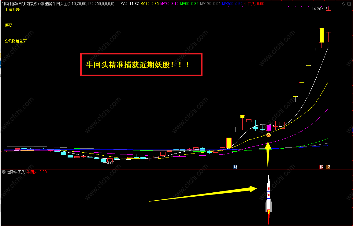趋势流“红、黄、兰、红”多头排列——即为“牛”,表明市场牛气十足、异常活跃