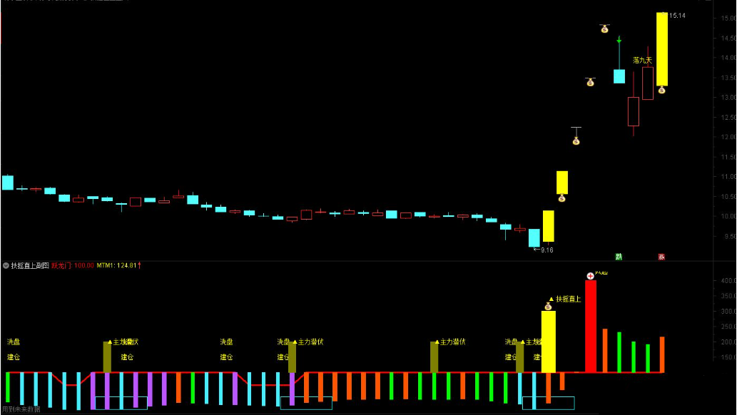 2、扶摇直上信号:确认主力拉升信号,是大趋势行情的启动信号,主要伴随着股价突破,代表上车位置。