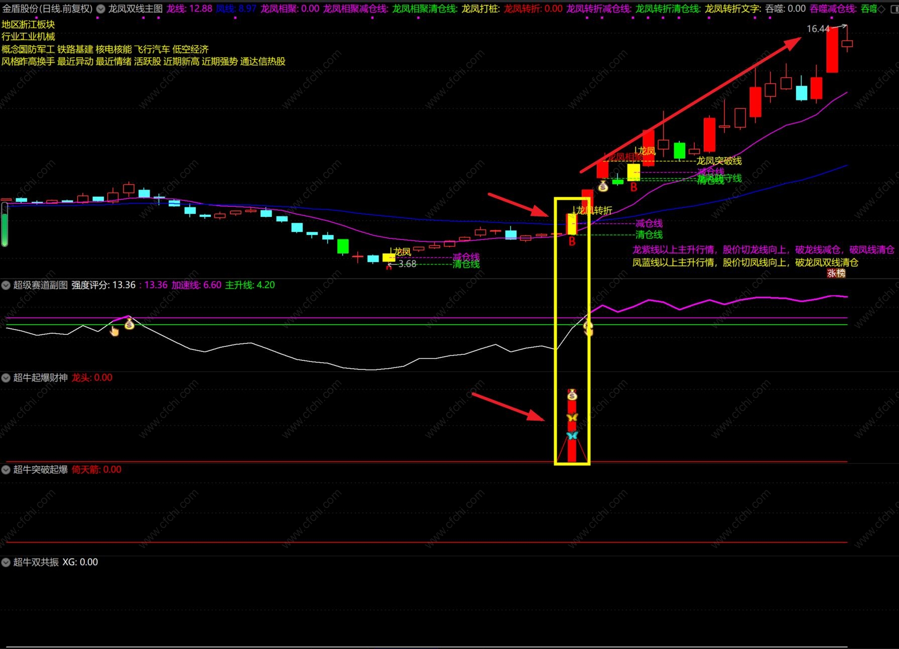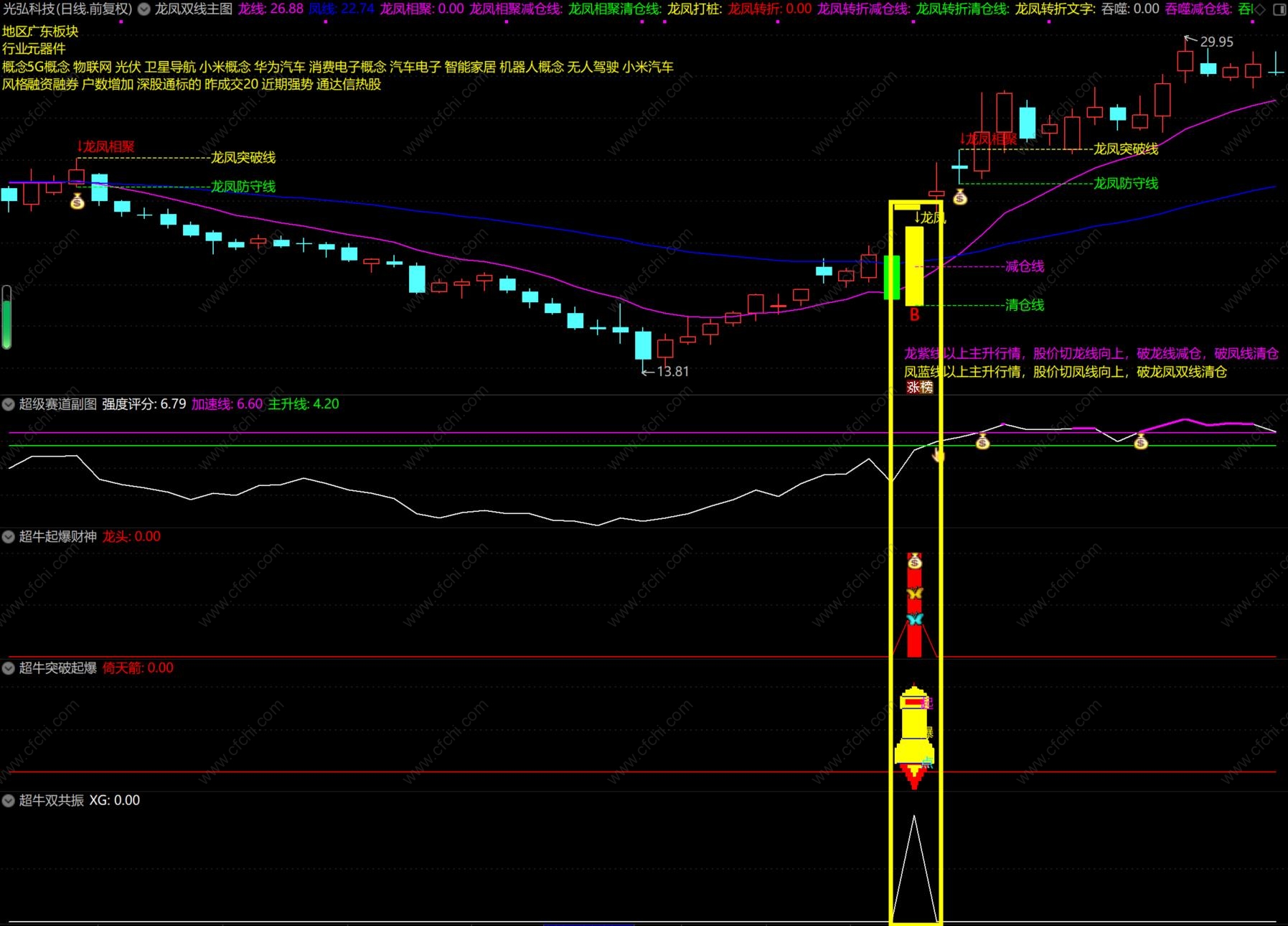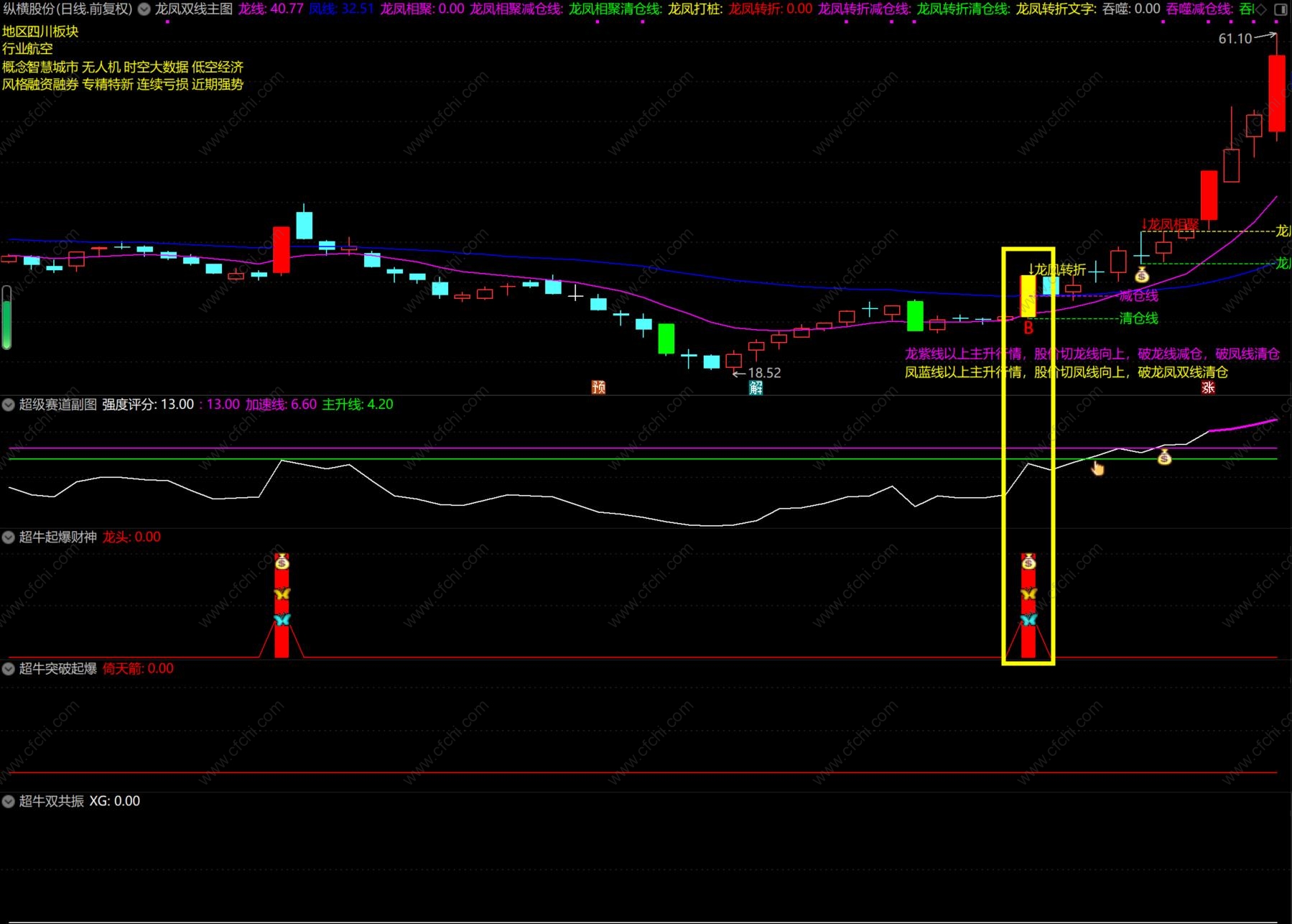 其中一个副图指标:超凡起爆财神,这个公式引用了MACD的周月线,这是未来函数,介意的可以不用该副图。