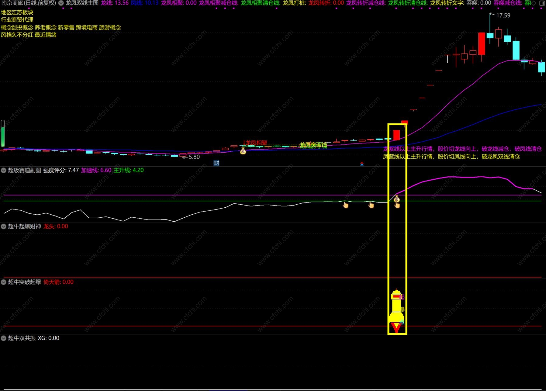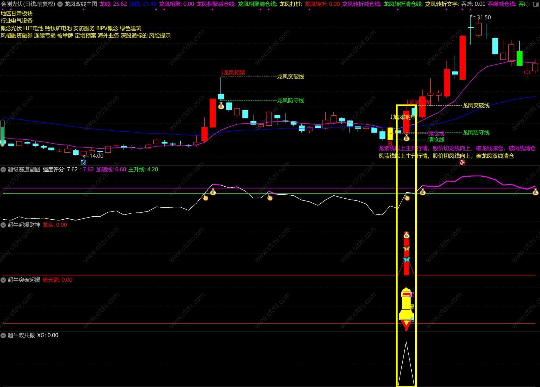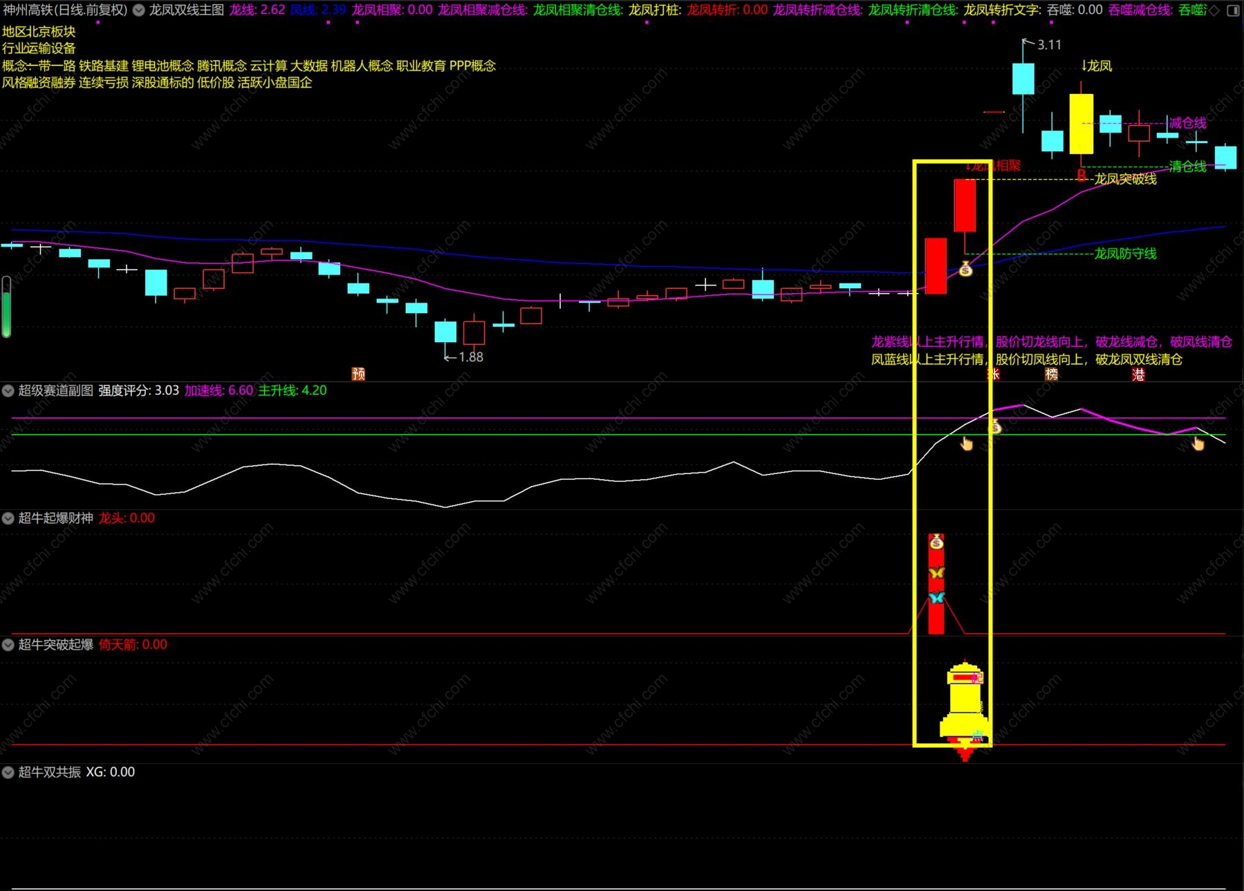 其中一个副图指标:超凡起爆财神,这个公式引用了MACD的周月线,这是未来函数,介意的可以不用该副图。