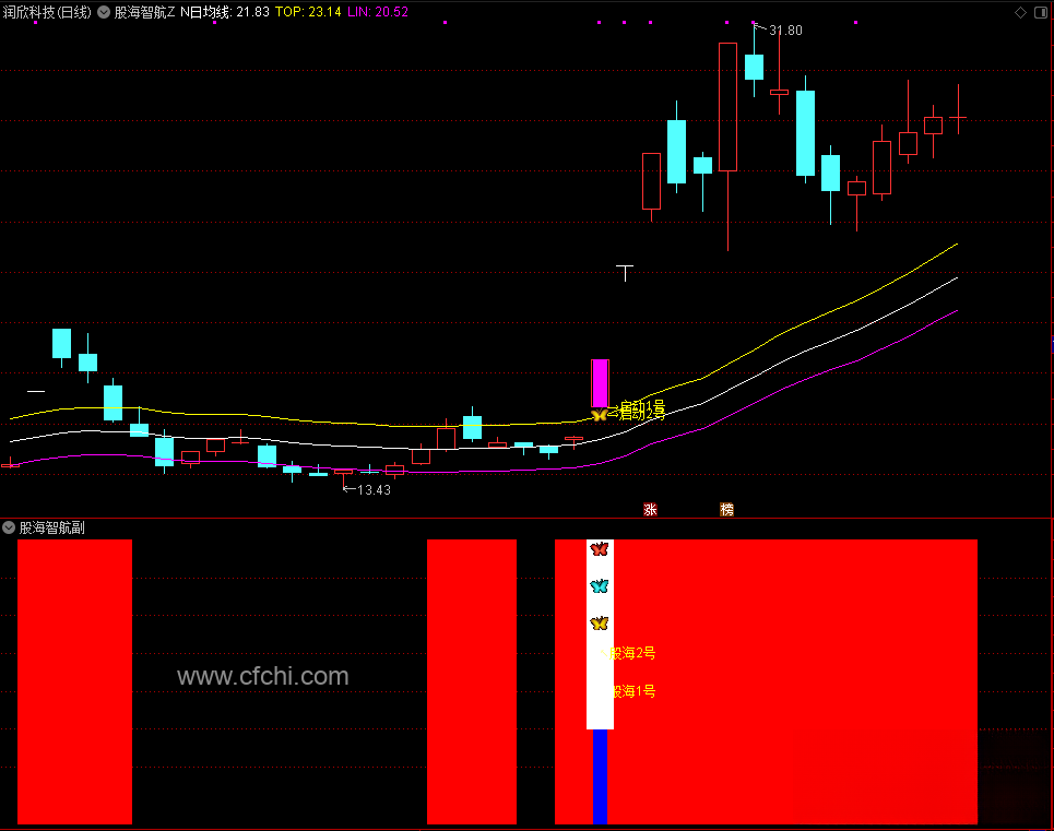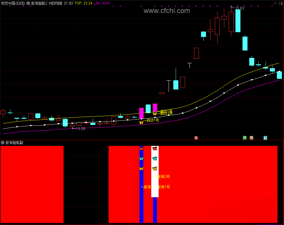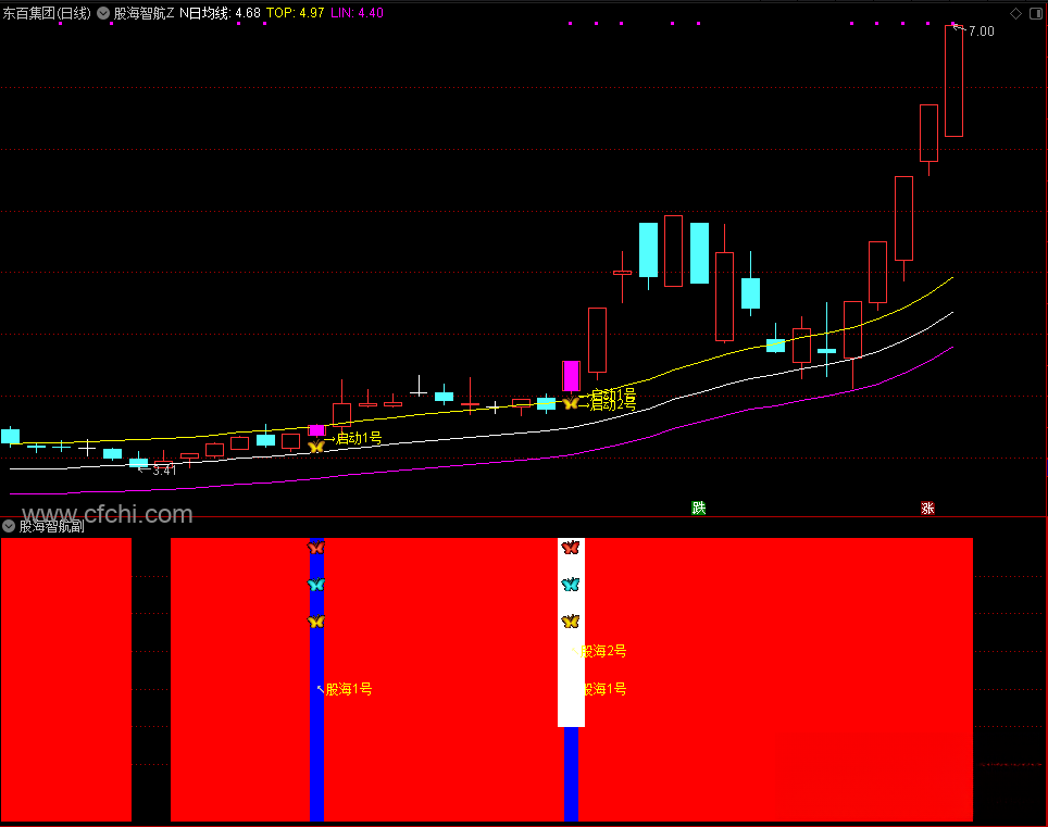 3、启动信号:当股价首次突破黄色线,且出现多头趋势时,通过主图洋红色K"金蝴蝶"启动信号,来发出潜在的买入信号,副图以红色和白色柱子表示股票收盘价与顶线的关系。当收盘价"N