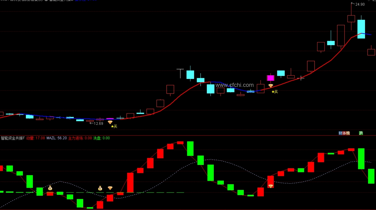 5、当市场经历一波下跌后,首次同时出现绿色柱(主力洗盘)与红色柱(动量趋势转强),指标将触发“钱袋子”信号,作为下跌后的潜在入场机会。