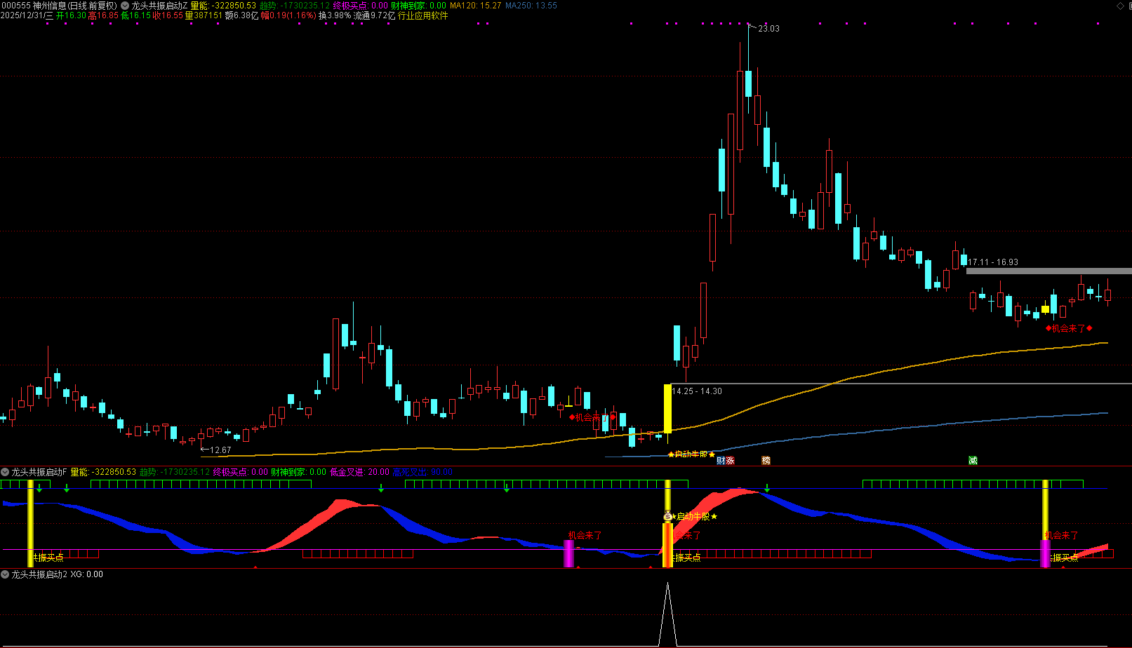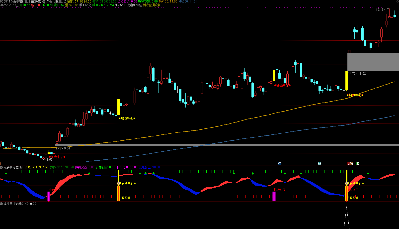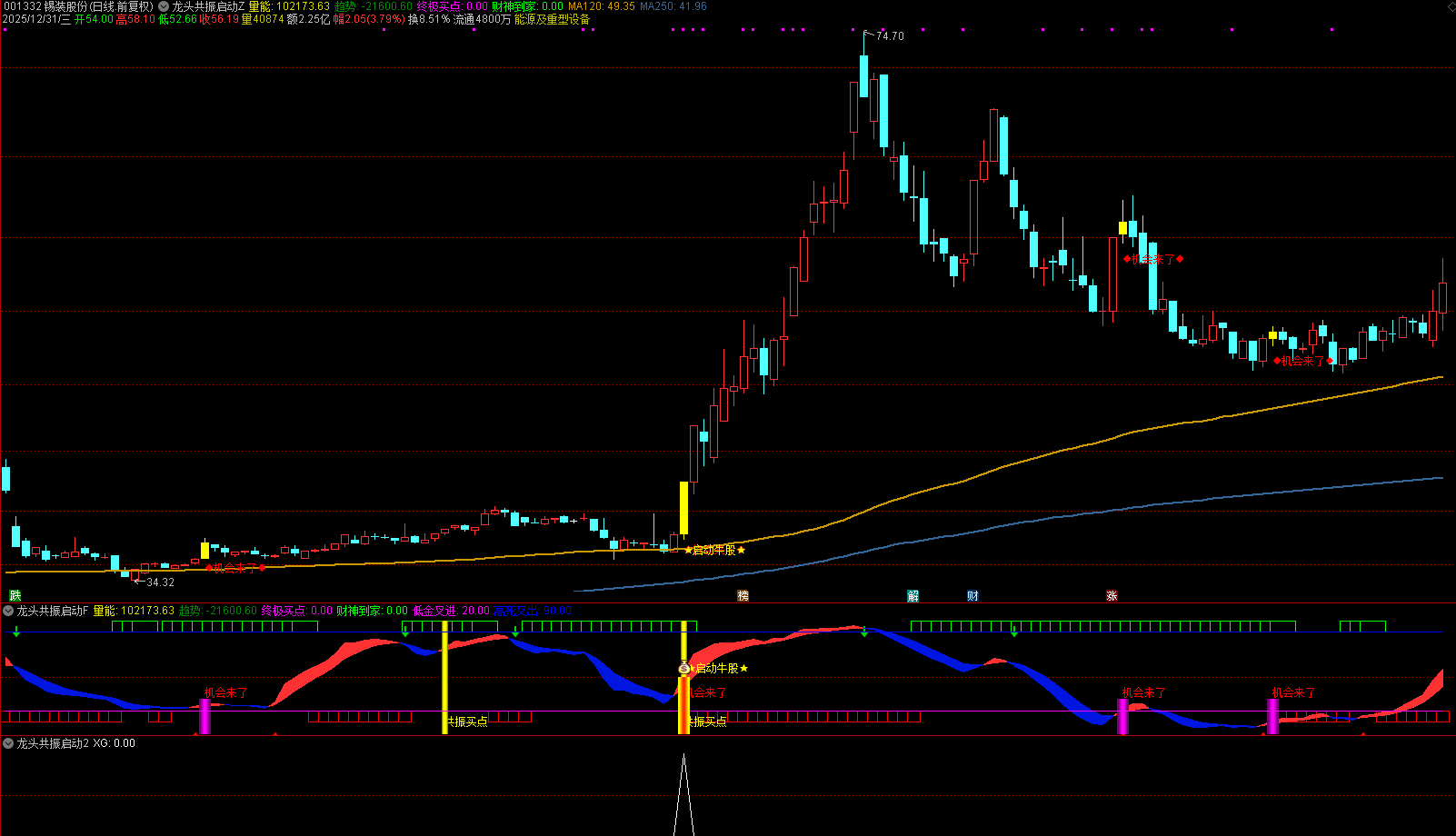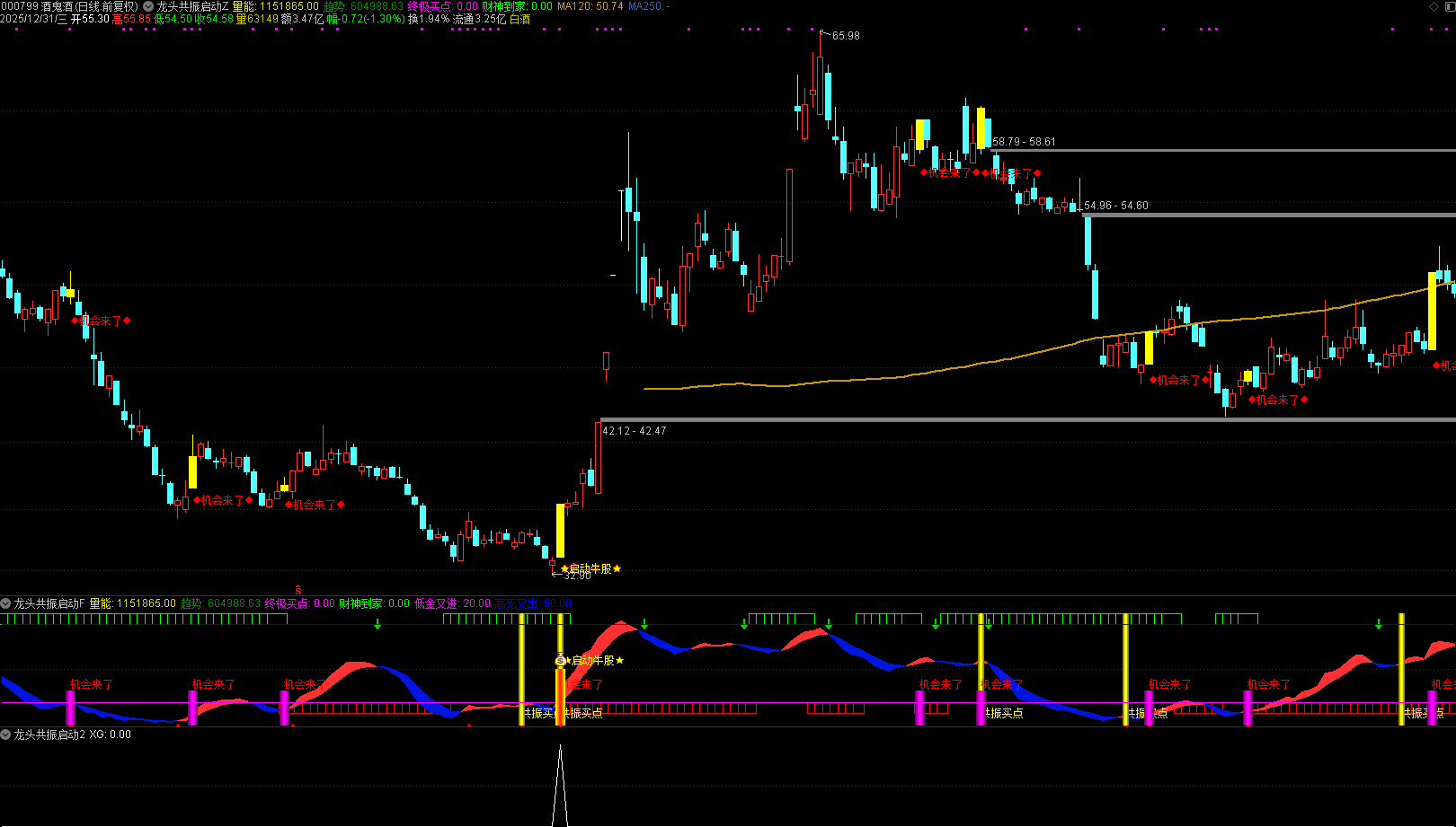 第一步:识别基础机会信号。当界面出现红色「◆机会来了◆」文字提示时,代表短期趋势出现积极转向,且量能配合到位。此时需结合整体趋势线(指标自带的强弱分界线)判断,若数据处于强弱分界线之上,信号可信度更高;若处于线下,需观察是否伴随明显的趋势突破力度。