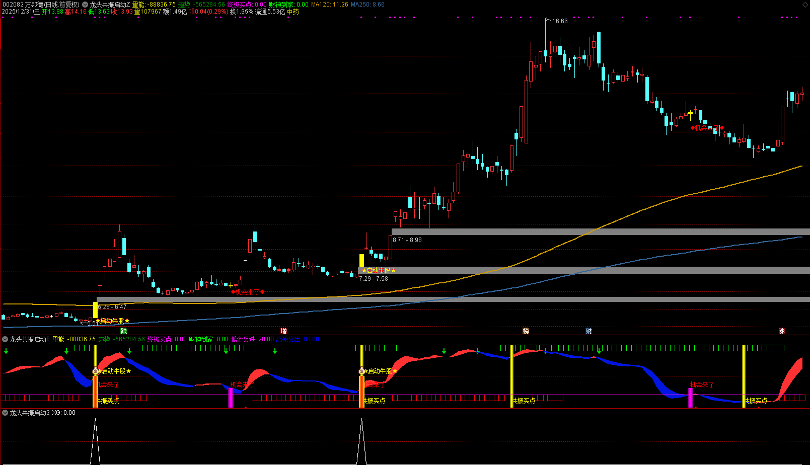 第二步:锁定强势启动信号。当界面出现蓝白色「★启动牛股★」文字提示时,代表完成趋势、量能、短期转向的多重共振,是核心观测节点。此时界面会同步出现黄色K线标注,直观区分普通节点与核心节点,无需额外对比其他数据。