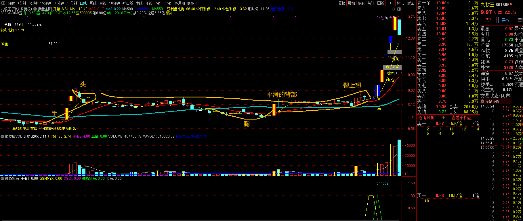 【屠龙绝杀】由涨停后第二天分歧,第三天反拉上影线试盘平台,回踩13日线后止跌反拉
